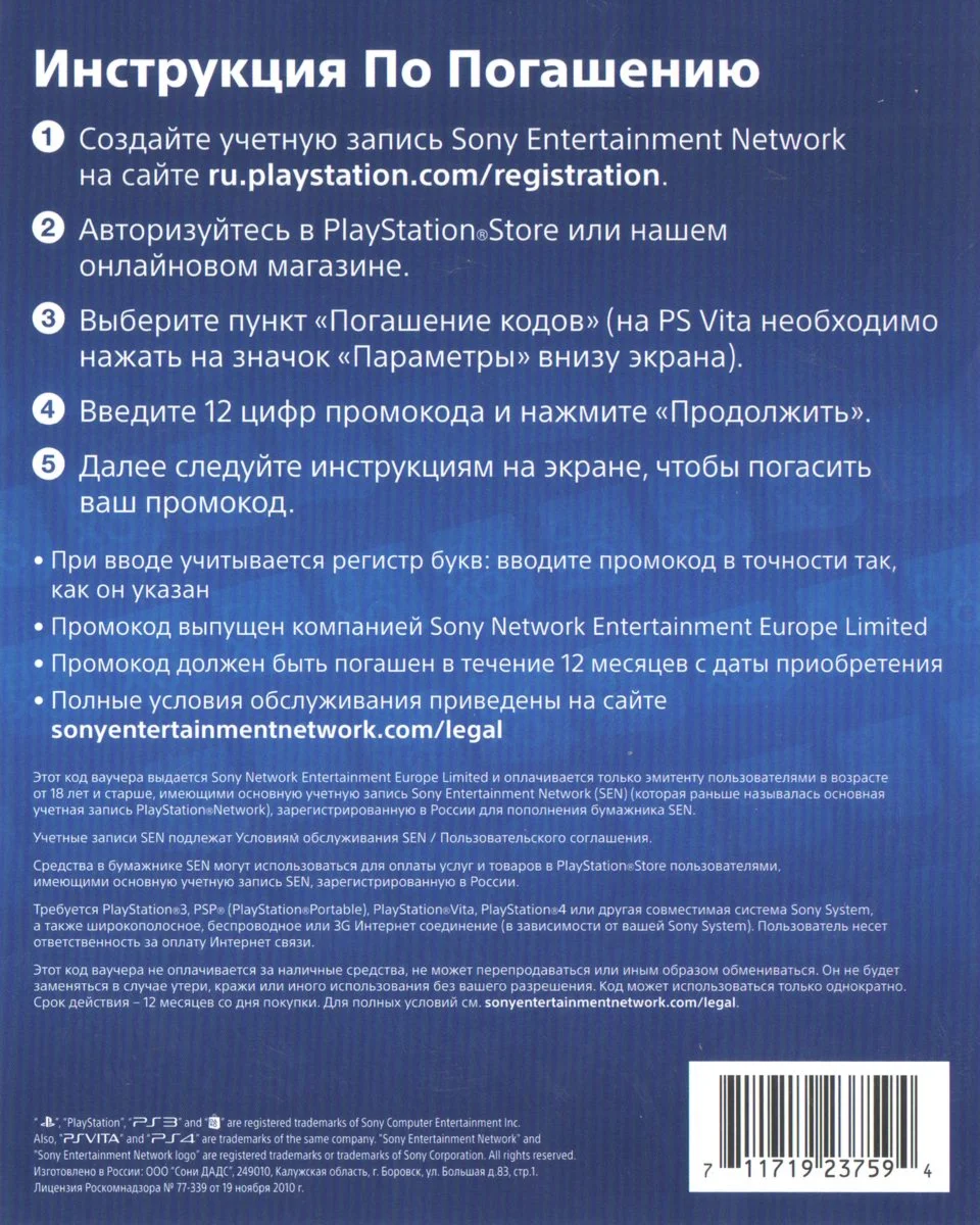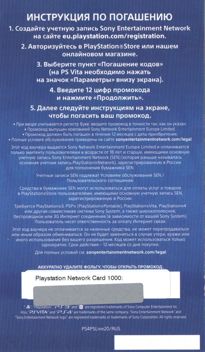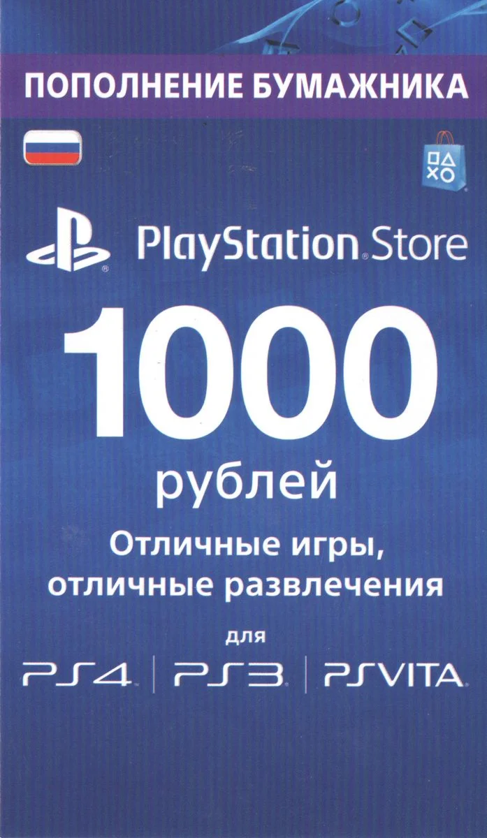 Карта оплаты PlayStation Network (PSN) 1000 позволяет пополнить баланс виртуального бумажника PlayStation Store на 1000 рублей